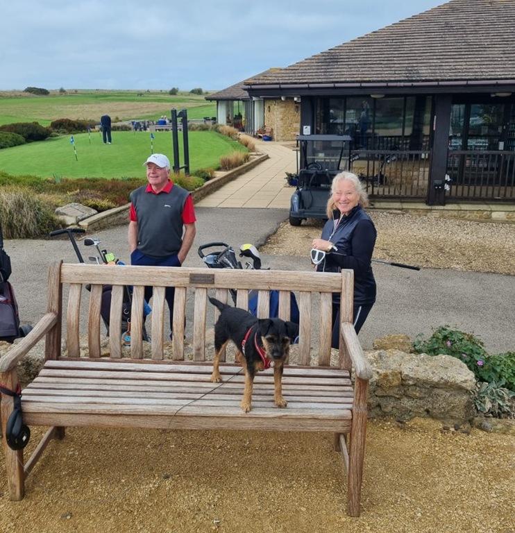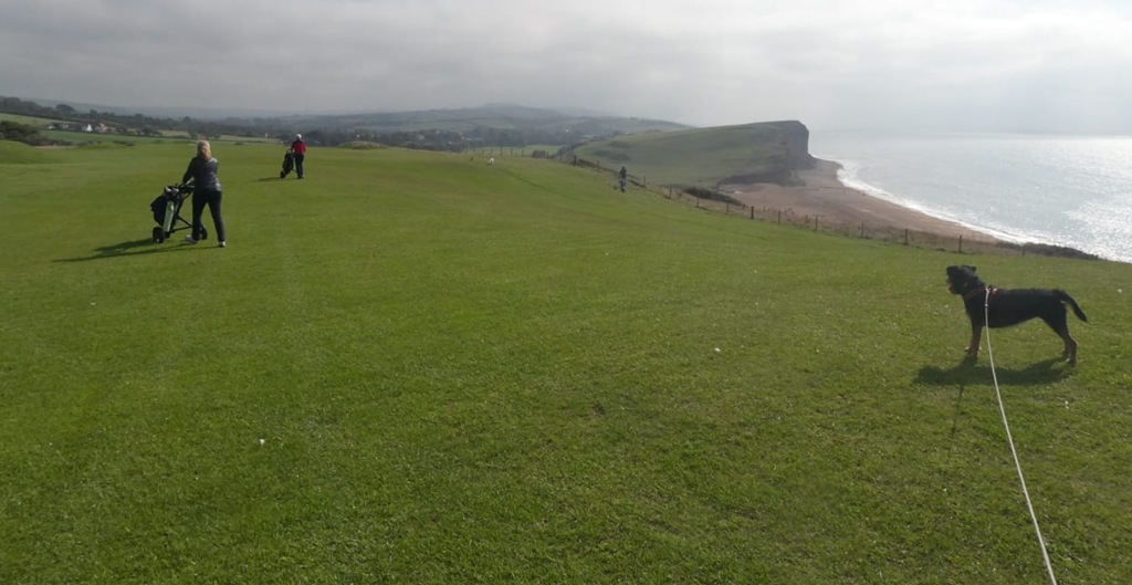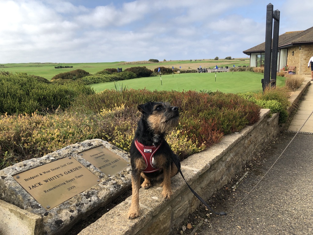 Wind Down – The course had a superb clubhouse restaurant (one of the best bacon butties I’ve had on a course), but dogs were not allowed inside (there is a lovely deck area looking over the sea), so we decided to try the nearby West Bay Hotel which Jeannie’s persons, Sue and John, thought was the best pub food in West Bay and it was a delicious lunch with the very tasty local brew, Palmers.